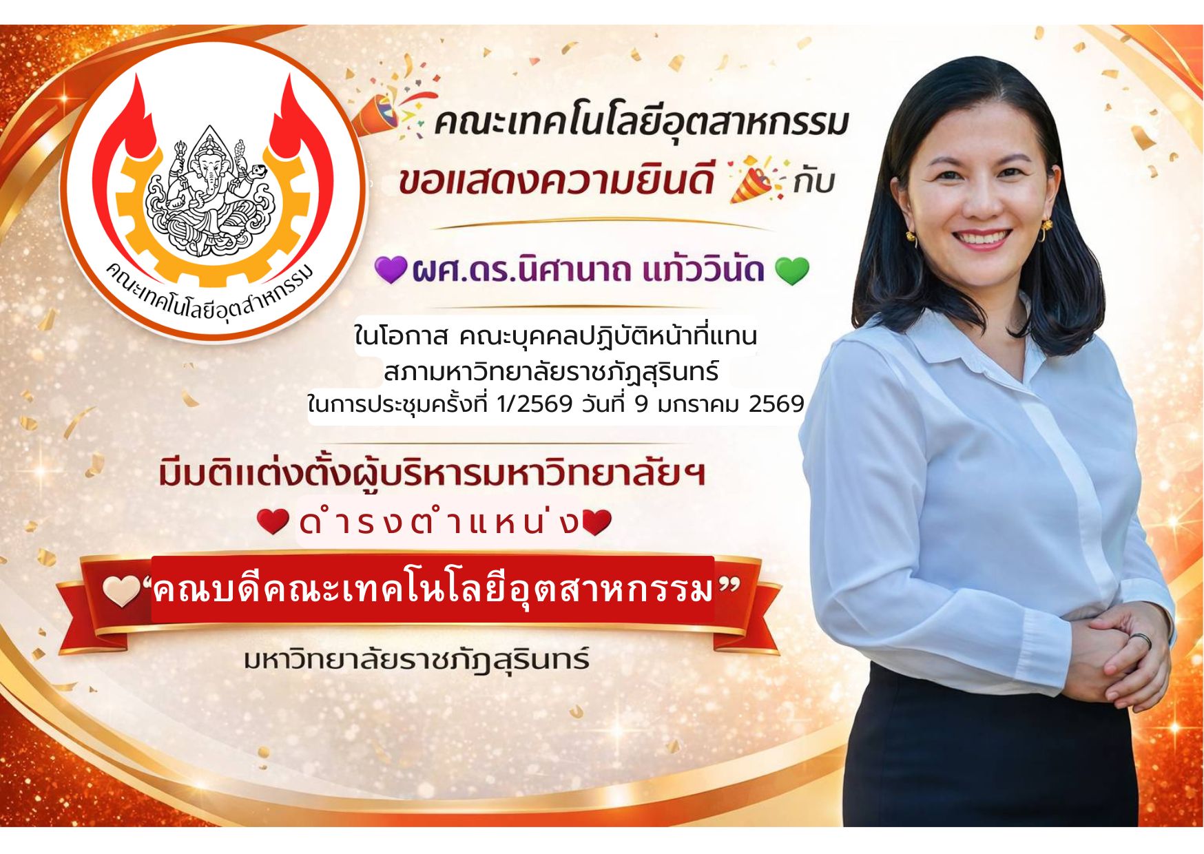 คณะเทคโนโลยีอุตสาหกรรม ขอแสดงความยินดีอย่างยิ่ง กับ ผู้ช่วยศาสตราจารย์ ดร.นิศานาถ แก้ววินัด เนื่องในโอกาส ที่ประชุมคณะบุคคลปฏิบัติหน้าที่แทนสภามหาวิทยาลัยราชภัฏสุรินทร์
