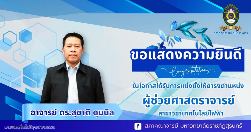 ขอแสดงความยินดี คณะเทคโนโลยีอุตสาหกรรม มหาวิทยาลัยราชภัฏสุรินทร์ ขอแสดงความยินดีกับ อาจารย์ ดร.สุชาติ ดุมนิล สาขาวิชาเทคโนโลยีไฟฟ้า ในโอกาสได้รับการแต่งตั้งให้ดำรงตำแหน่ง ผู้ช่วยศาสตราจารย์ by สังเวียน ก้อนทอง | Feb 16, 2026 | ข่าวประชาสัมพันธ์ ขอแสดงความยินดี คณะเทคโนโลยีอุตสาหกรรม มหาวิทยาลัยราชภัฏสุรินทร์ ขอแสดงความยินดีกับ อาจารย์ ดร.สุชาติ ดุมนิล สาขาวิชาเทคโนโลยีไฟฟ้า ในโอกาสได้รับการแต่งตั้งให้ดำรงตำแหน่ง ผู้ช่วยศาสตราจารย์ ด้วยความปรารถนาดียิ่ง
