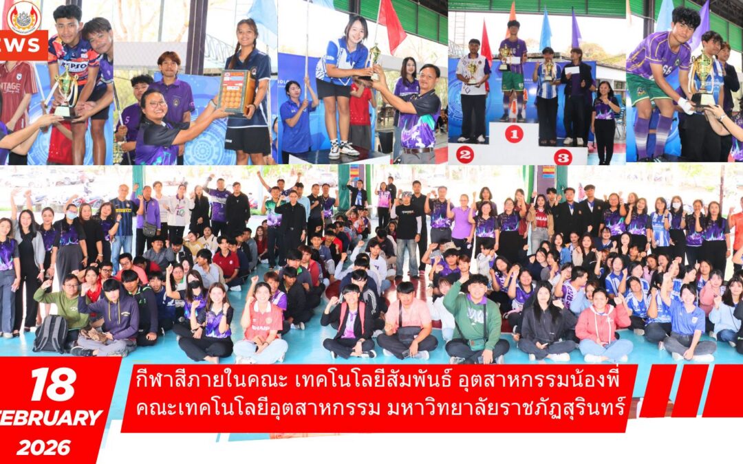 คณะเทคโนโลยีอุตสาหกรรม จัดกิจกรรมกีฬาสีภายในคณะ “เทคโนโลยีสัมพันธ์ อุตสาหกรรมน้องพี่” เพื่อเสริมสร้างความสามัคคี ความสัมพันธ์อันดีระหว่างรุ่นพี่–รุ่นน้อง และส่งเสริมการออกกำลังกายของนักศึกษา ภายใต้บรรยากาศแห่งความสนุกสนานและมิตรภาพ
